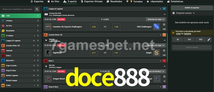 O doce888 oferece uma grande seleção de opções de apostas em e-sports com probabilidades competitivas